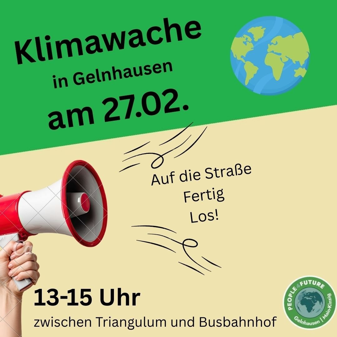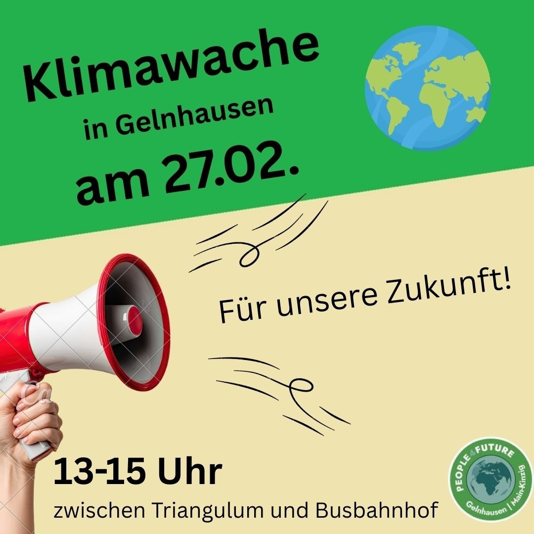 Am Freitag, den 27. Februar 2026, findet im Rahmen der bundesweiten Klimaproteste in Gelnhausen eine Klimawache statt. Zwischen 13 Uhr und 15 Uhr werden sich die People For Future auf dem Triangulum-Parkplatz – am Geländer zum Busbahnhof nahe dem Zebrastreifen – versammeln und auf die Bedeutung von Klimaschutz, Demokratie und sozialer Gerechtigkeit mit klarem Blick auf die bevorstehende Kommunalwahl am 15. März aufmerksam machen.
